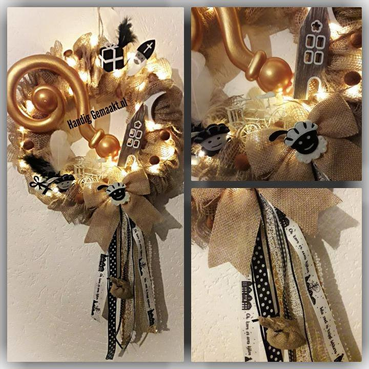 krans met gouden staf en zwart/witte figuurtjes met verlichting op timer