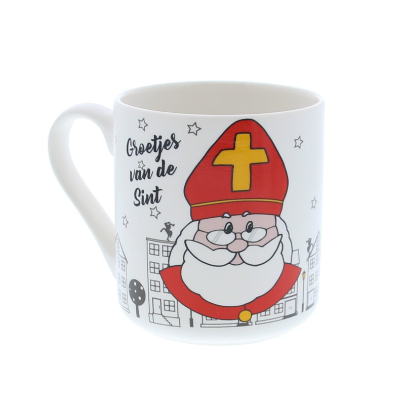 Overzichtmooie witte mok met tekst groetejs van de sint en afbeelding huisjes en sinterklaas