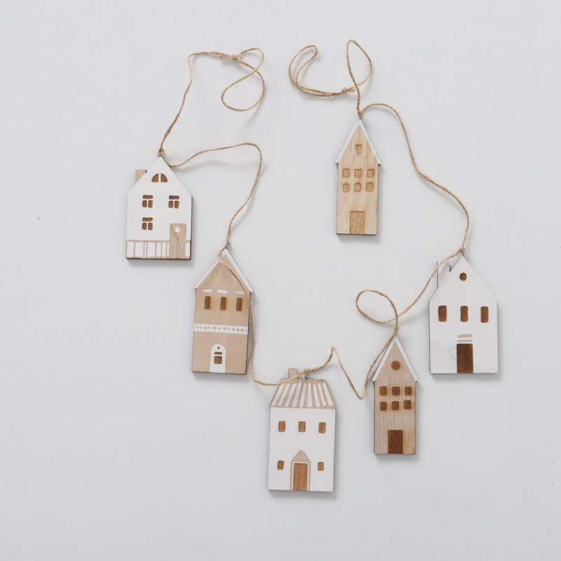 jute touw met daaraan 6 houten huisjes