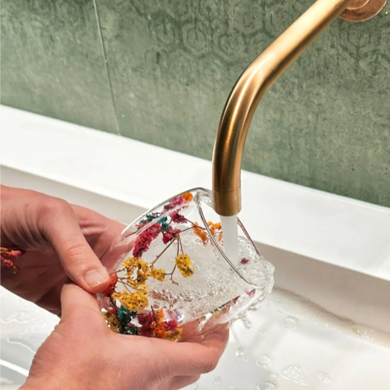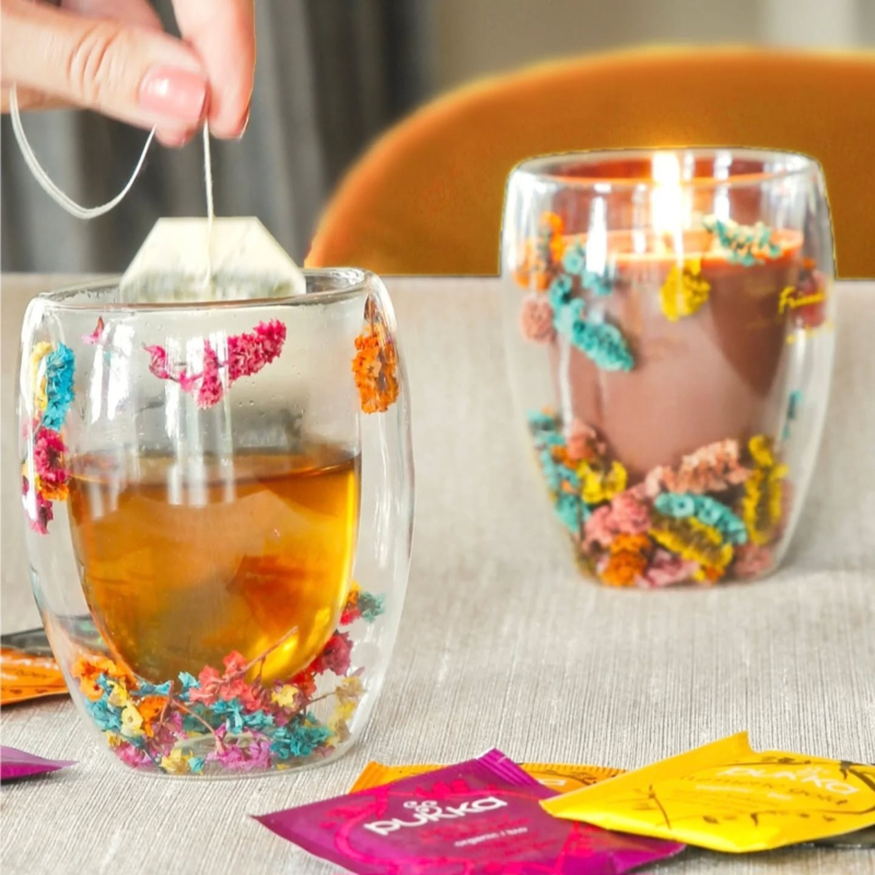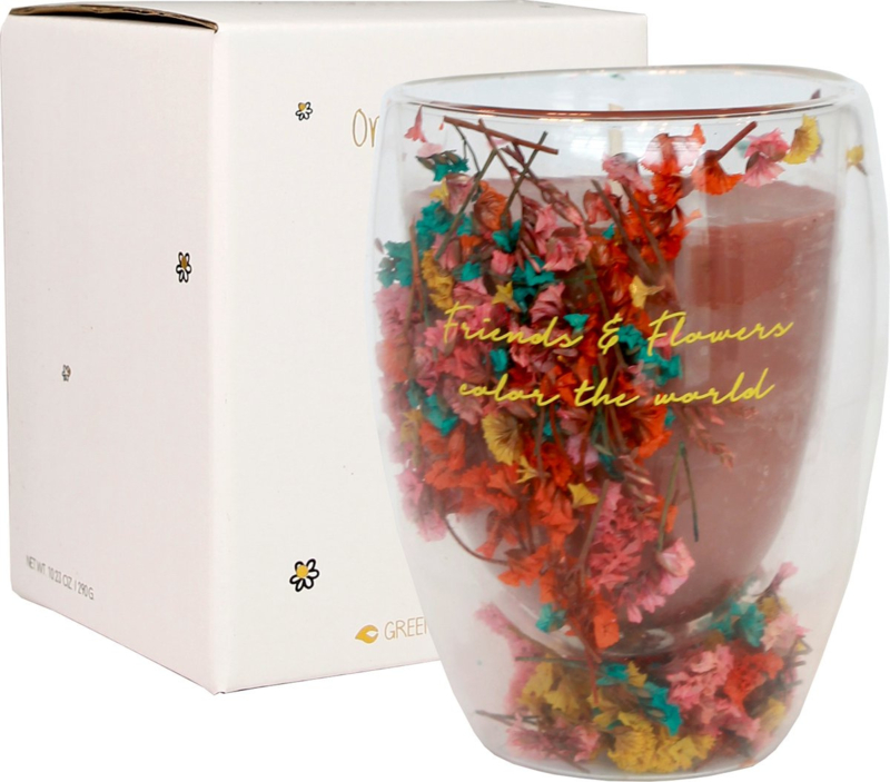 Artikelnummer: GL.DWF.022.07 OverzichtDeze luxe geurkaarsen hebben een dubbele wand waar gedroogde bloemetjes tussen zitten. Een èchte eyecatcher! Deze kaars ziet er niet alleen leuk uit, als de kaars is opgebrand, kan je het glas gebruiken als theeglas of een andere heet of koud drankje. Door de dubbele wand zorgt het glas ervoor dat je drankje warm blijft, zonder dat je handen ook heet worden.