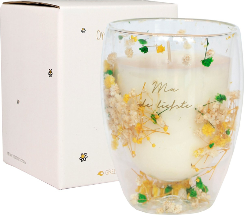 Artikelnummer: GL.DWF.022.06 OverzichtDeze luxe geurkaarsen hebben een dubbele wand waar gedroogde madeliefjes tussen zit. Een èchte eyecatcher! Deze kaars ziet er niet alleen leuk uit, als de kaars is opgebrand, kan je het glas gebruiken als theeglas bijvoorbeeld of een andere heet of koud drankje. Door de dubbele wand zorgt het glas ervoor dat je drankje warm blijft, zonder dat je handen ook heet worden.