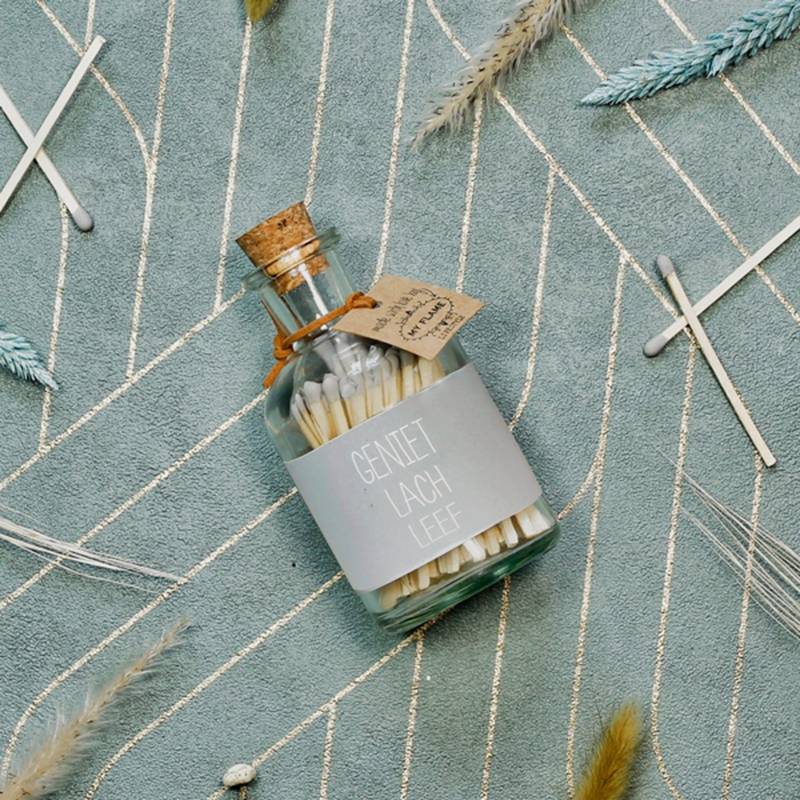 Artikelnummer: MTCH.LGRY OverzichtEen glazen potje met 80 licht grijze lucifers. Met deze lucifers ben je helemaal in stijl met een matchende kaars. Het potje wordt gesierd met de tekst 'Geniet, Lach, Leef'.